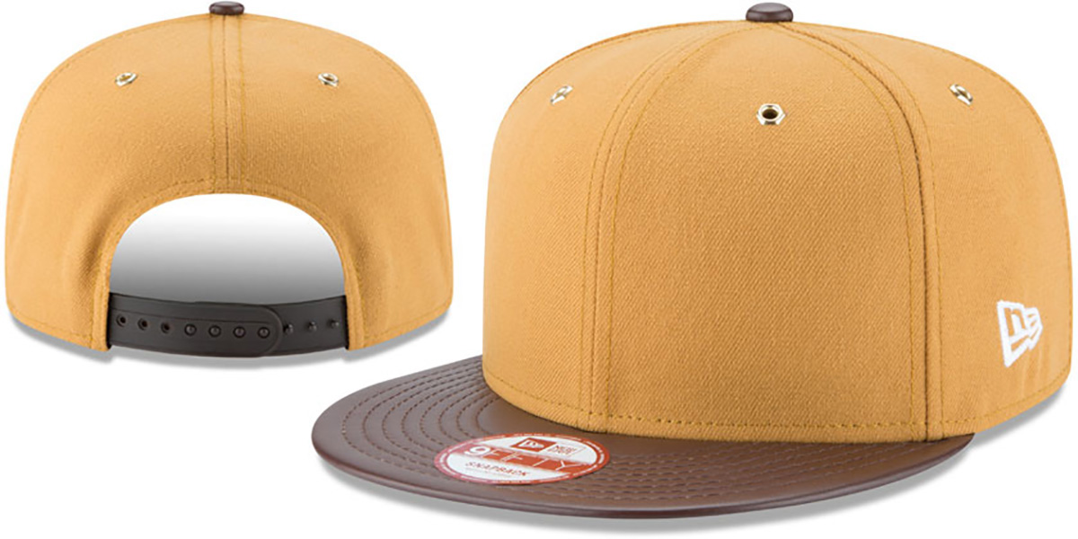 Authentic adjustable hat by New Era with original 9FIFTY cut and flat brim, wheat (panama tan) authentic poly crown, brown P/U (faux leather) visor, light grey undervisor, raised embroidered team logo on front in brown and white, gold metal eyelets, brown snapback closure, This hat designed as a Timberland hookup. This hat is made by New Era.