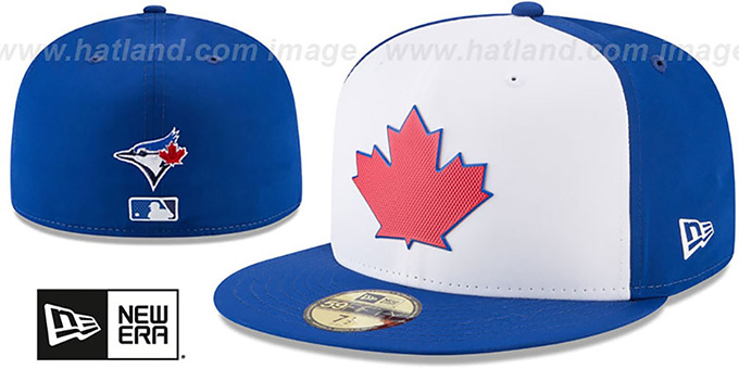 Authentic and ORIGINAL 59FIFTY fitted hat by New Era, Featherweight poly ProLight moisture wicking and UV protective performance royal blue deep crown and visor and white front panels, light grey undervisor, beveled rubber Alternate team logo on front, beveled New Era flag logo on side, matching beveled rubber MLB logo on back, This is the style of Onfield hat worn by all MLB teams for the 2018 season in Batting Practice before all games. This Toronto Blue Jays baseball cap is made by New Era and is licensed by the MLB - Major League Baseball.