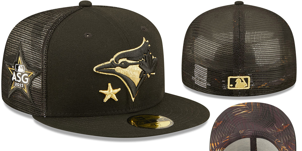 Authentic and ORIGINAL 59FIFTY fitted hat by New Era, black authentic poly front panels and visor with black trucker mesh middle and back panels, orange gold and grey palm print on undervisor-sweatband-inside seams, raised embroidered team logo on front in metallic gold with one metallic gold star, matching 2022 All-Star logo patch on side, metallic gold embroidered New Era logo on opposite side, matching raised embroidered MLB logo on back, This is the hat worn during 2022 All-Star Game in Los Angeles. This Toronto Blue Jays baseball cap is made by New Era and is licensed by the MLB - Major League Baseball.