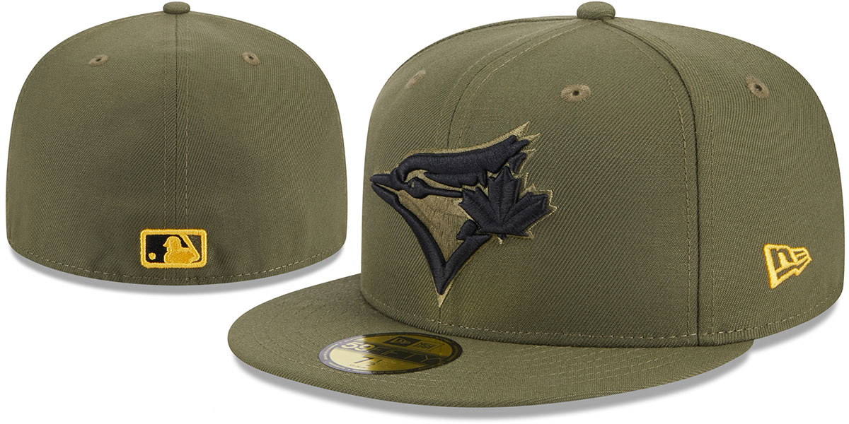 Authentic and ORIGINAL 59FIFTY fitted performance poly hat by New Era, moss olive green crown and visor with light grey undervisor, tonal raised embroidered USA Flag with team logo on front in black and olive, no Armed Forces patch on side, New Era logo on opposite side in metallic gold, matching MLB logo on back in metallic gold with black fill, This is the Onfield hat worn by all MLB teams in games played during the 2023 Armed Forces weekend. These commemorative caps honor our Armed Forces through patriotic themes that remind us all of the dedication of our troops. A portion of proceeds from the sale of 'Stars & Stripes' caps support the Welcome Back Veterans Fund, an organization that provides support to veterans and their families when they come home from overseas. This Toronto Blue Jays baseball cap is made by New Era and is licensed by the MLB - Major League Baseball.