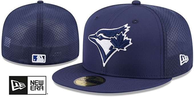 MLB Authentic Collection and ORIGINAL 59FIFTY fitted nylon poly hat by New Era, light navy blue nylon crown and visor with navy batting practice lightweight performance mesh middle and back panels, navy undervisor, raised embroidered team logo on front, embroidered New Era logo on side, raised embroidered MLB logo on back in team colors, This is the style of Onfield Batting Practice hat worn by MLB teams during the 2026 MLB season. This Toronto Blue Jays baseball cap is made by New Era and is licensed by the MLB - Major League Baseball.
