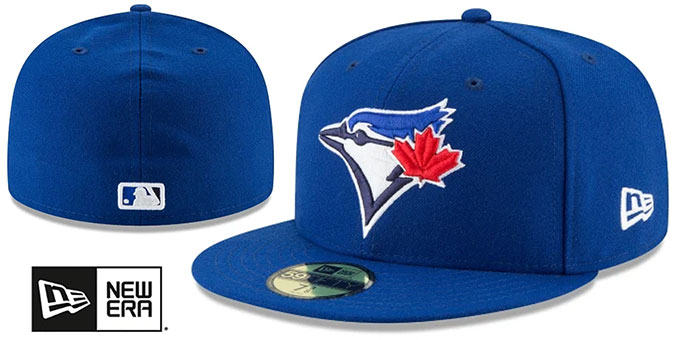 MLB Authentic Collection and ORIGINAL 59FIFTY fitted performance poly hat by New Era, royal blue deep crown and visor, black undervisor, raised embroidered team logo on front, embroidered New Era logo on side, raised embroidered MLB logo on back, This is the style of Onfield hat worn by all MLB teams during the MLB season. This Toronto Blue Jays baseball cap is made by New Era and is licensed by the MLB - Major League Baseball.