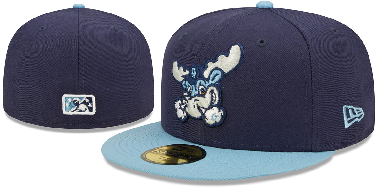 Authentic and ORIGINAL 59FIFTY onfield poly fitted hat by New Era, light navy blue crown and sky (light) blue visor, black undervisor, embroidered Wilmington Blue Rocks Minor League onfield team logo on front, New Era logo on side, matching raised embroidered MiLB Minor League logo on back, These hats are the Authentic Onfield hats worn during Minor League games, they are the High-A affiliate of the Washington Nationals. This Wilmington Blue Rocks baseball cap is made by New Era and is licensed by the MiLB - Minor League Baseball.
