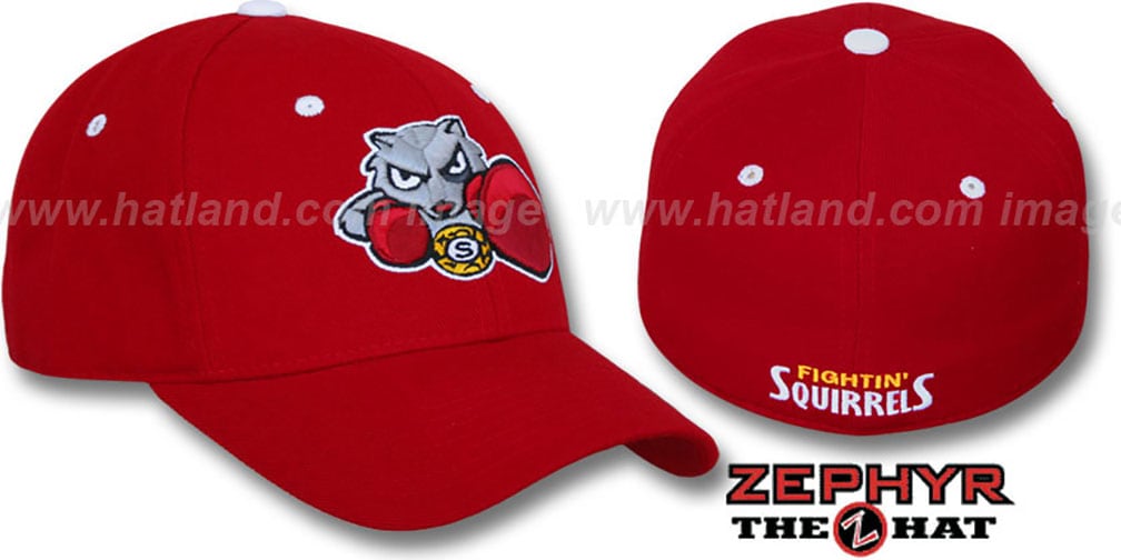 low profile structured hat with rounded crown, red wool blend crown and visor, raised original custom and exclusive embroidery by Zephyr on front, embroidered secondary logo on back. This Bradford Fighting Squirrels hat is made by Zephyr and is licensed by the NCAA College.