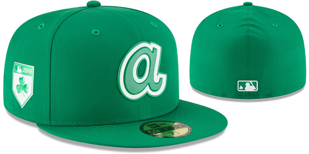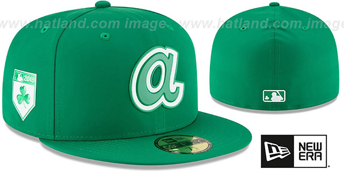 Authentic and ORIGINAL 59FIFTY fitted hat by New Era, kelly green Featherweight poly ProLight moisture wicking and UV protective performance deep crown and visor, light grey undervisor, beveled rubber team logo on front in kelly green and white, matching beveled rubber Shamrock shield side patch, matching beveled rubber MLB logo on back with shamrock inside logo, This is the style of Onfield hat worn by all MLB teams for St Patrick's Day 2018. This Atlanta Braves baseball cap is made by New Era and is licensed by the MLB - Major League Baseball.