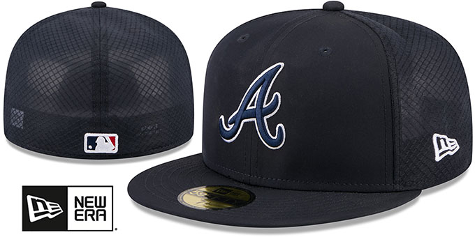 MLB Authentic Collection and ORIGINAL 59FIFTY fitted nylon poly hat by New Era, navy blue nylon crown and visor with navy batting practice lightweight performance mesh middle and back panels, navy undervisor, raised embroidered team logo on front, embroidered New Era logo on side, raised embroidered MLB logo on back in team colors, This is the style of Onfield Batting Practice hat worn by MLB teams during the 2026 MLB season. This Atlanta Braves baseball cap is made by New Era and is licensed by the MLB - Major League Baseball.