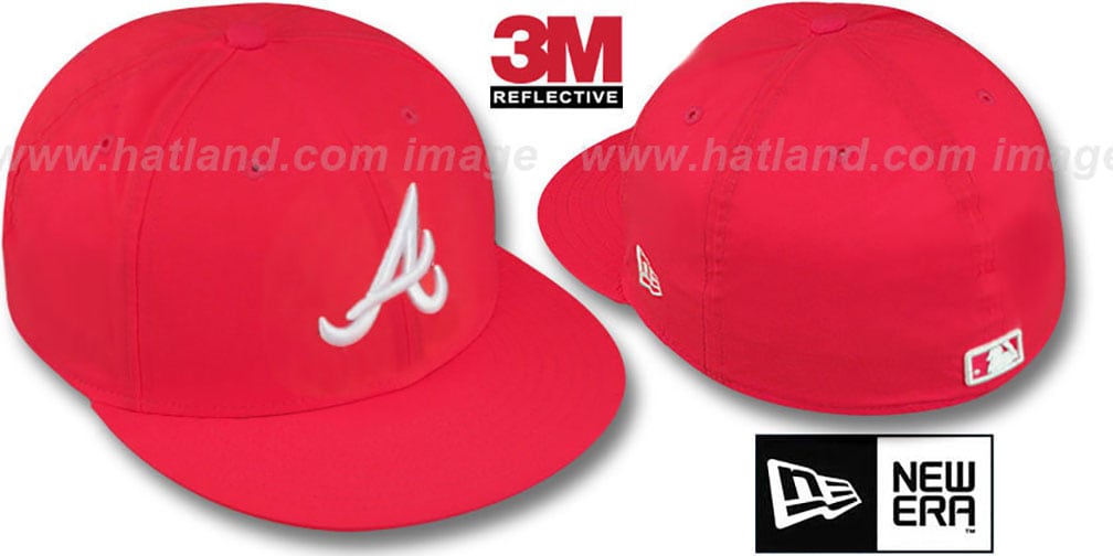 > Authentic and ORIGINAL 59FIFTY poly-nylon fitted hat by New Era, red deep crown and visor produced in 3M Reflective material with poly liner, raised embroidered primary team logo on front in white glow-in-the-dark thread, matching raised embroidered MLB logo on back. This Atlanta Braves baseball cap is made by New Era and is licensed by the MLB Major League Basebell.