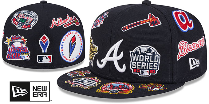 Authentic and ORIGINAL 59Fifty fitted hat by New Era, navy blue authentic poly deep crown and visor with a light grey undervisor, raised embroidered team logo on front, embroidered Cooperstown and associated team logos embroidered ALL-OVER crown and visor, embroidered MLB Batterman logo on back. This Atlanta Braves hat is made by New Era and is licensed by the MLB - Major League Baseball.
