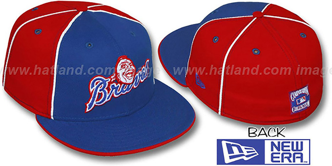 'Authentic' and ORIGINAL 59FIFTY fitted hat by New Era, royal blue wool front panels and visor, red mid panels-back panels-and flip visor, white piping on mid seams, raised embroidered New Era ORIGINAL DECEPTOR-2 Cooperstown team logo on front and matching COOPERSTOWN logo on back. This Atlanta Braves baseball cap is made by New Era and is licensed by the MLB - Major League Baseball.