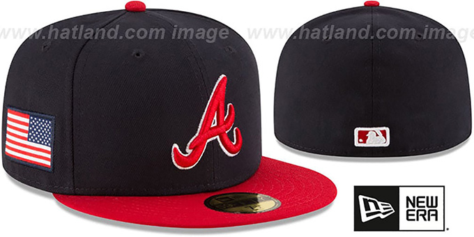 Authentic and Original 59FIFTY fitted hat by New Era, navy blue poly deep crown and red visor, light grey undervisor, raised embroidered team logo on front in red and white, embroidered side patch USA Flag applique, New Era Flag on opposite side, matching raised embroidered MLB logo on back. This Atlanta Braves baseball cap is made by New Era and is licensed by the MLB - Major League Baseball.
