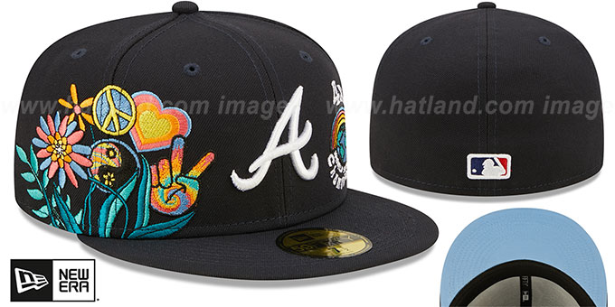 Excitingly authentic! This dark navy 59FIFTY fitted hat by New Era features a sky blue undervisor, a raised embroidered team logo on the front surrounded by groovy peace signs, hearts, and flowers, plus a 4X WORLD SERIES embroidered accent and the iconic New Era logo on the side. A true collector's piece. This Atlanta Braves baseball cap is made by New Era and is licensed by the MLB - Major League Baseball.
