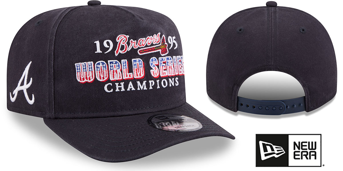 Adjustable A-FRAME five panel hat by New Era with pinched seam on front panels, navy blue cotton twill crown and visor with throwback dark kelly green undervisor, flat embroidered 1995 WORLD SERIES CHAMPIONS logo on front, embroidered New Era logo on side, flat embroidered team logo on opposite side, matching adjustable Snapback closure. This Atlanta Braves hat is made by New Era and is licensed by the MLB - Major League Baseball.