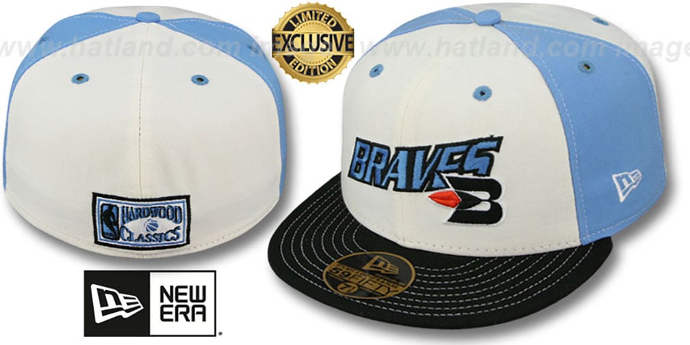 Authentic and ORIGINAL 59Fifty fitted hat by New Era, white front and back panels-sky (light) blue mid panels-black visor with white contrast stitching, raised embroidered New Era EXCLUSIVE 'TEAM UP' logo on front with matching HARDWOOD logo on back. This Buffalo Braves hat is made by New Era and is licensed by the NBA - National Basketball Association.