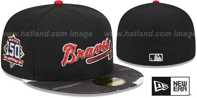 Authentic 59FIFTY fitted hat by New Era! This limited-edition cap features a bold black deep crown and an urban camouflage (black, light grey, dark grey, white) cotton visor. The light grey undervisor adds a sleek touch, while the raised embroidered metallic stitched team wordmark on the front and metallic embroidered New Era logo on the side make this hat truly stand out. Plus, the 150th Anniversary logo on the opposite side and matching MLB logo on the back complete the commemorative design. The best part? Each camo hat pattern is slightly different, so your hat will be one-of-a-kind. This Atlanta Braves baseball cap is made by New Era and is licensed by the MLB - Major League Baseball.