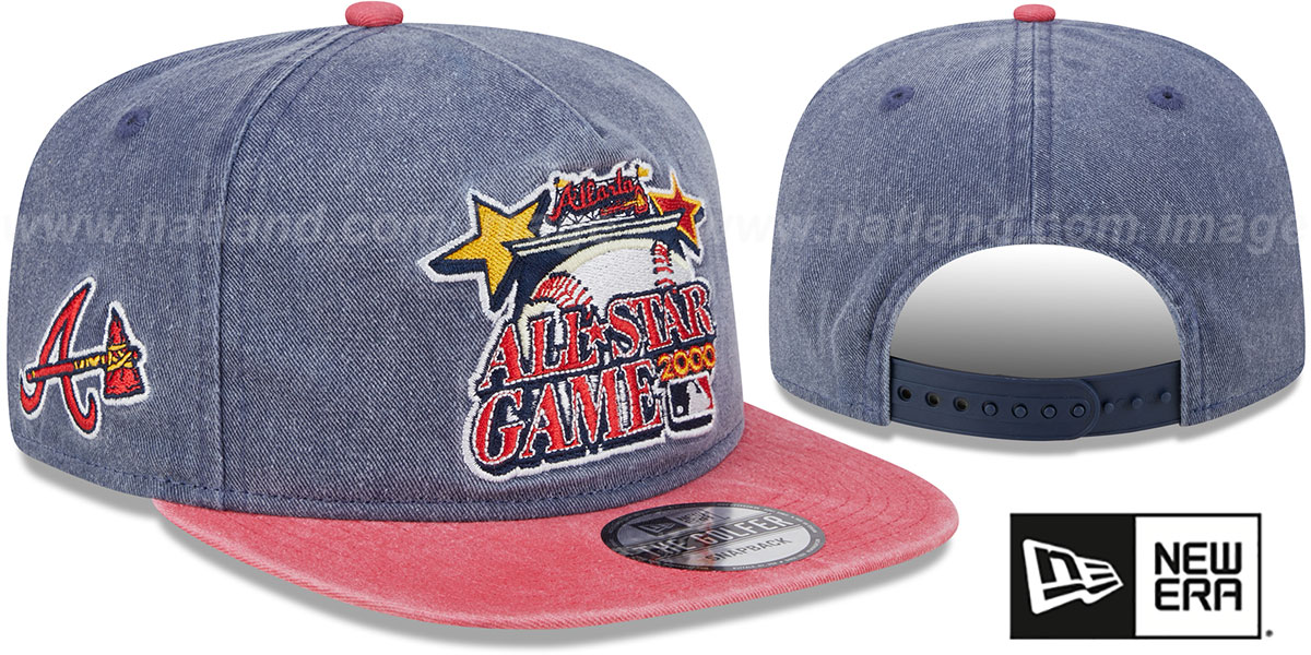Golfer's must-have: the A-FRAME five-panel adjustable hat by New Era! Featuring a pre-washed navy blue cotton twill crown and a bold red visor with a throwback dark green undervisor. Flat embroidered logos add eye-catching style - the 2000 All-Star Game logo on the front, the New Era logo on the side, and the Braves' alternate team logo on the opposite side. Finished with a matching adjustable snapback closure for a perfect fit. This Atlanta Braves hat is made by New Era and is licensed by the MLB - Major League Baseball.