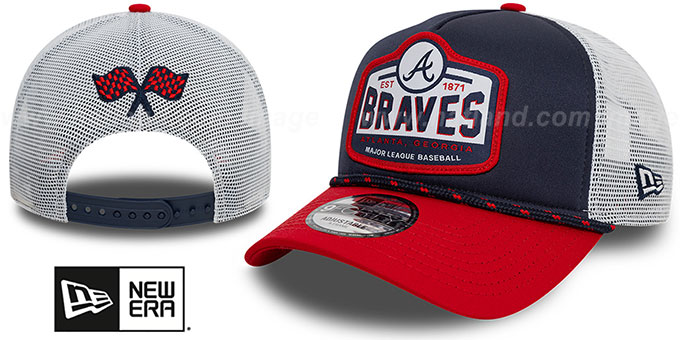 The New Era 9FORTY hat features a five-panel A-Frame design with a navy blue front, white mesh middle and back panels, and a red pre-curved visor and undervisor with a matching rope. The front showcases a foam-printed team patch logo with a red stitched outline, while the side displays the matching New Era logo. Above the navy snapback closure, embroidered crossed flags complete the look. This Atlanta Braves hat is made by New Era and is licensed by the MLB - Major League Baseball.