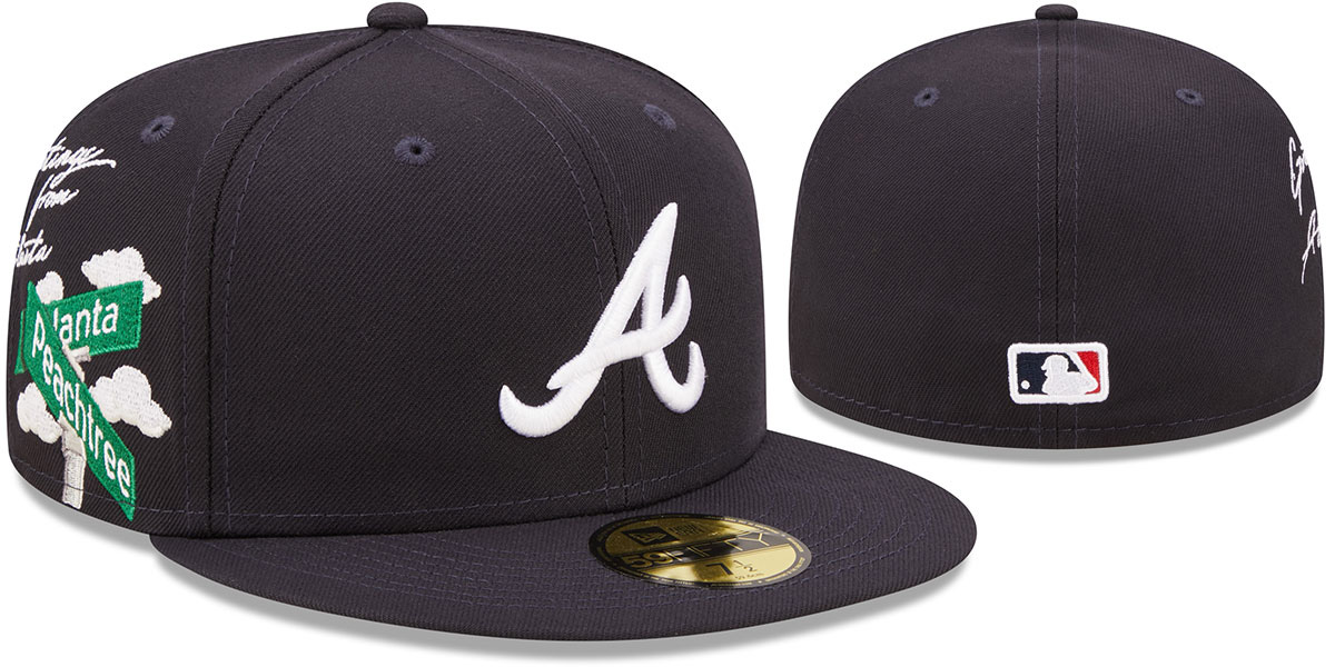 Iconic 59FIFTY fitted cap by New Era! Navy blue crown and visor in authentic poly, with light grey undervisor. Raised embroidered team logo on front, plus a side embroidered Atlanta city icon featuring a 'Greetings from' script and clouds. Opposite side boasts an embroidered New Era logo, while the back showcases a matching raised MLB logo. This is an original, authentic must-have. This Atlanta Braves baseball cap is made by New Era and is licensed by the MLB - Major League Baseball.