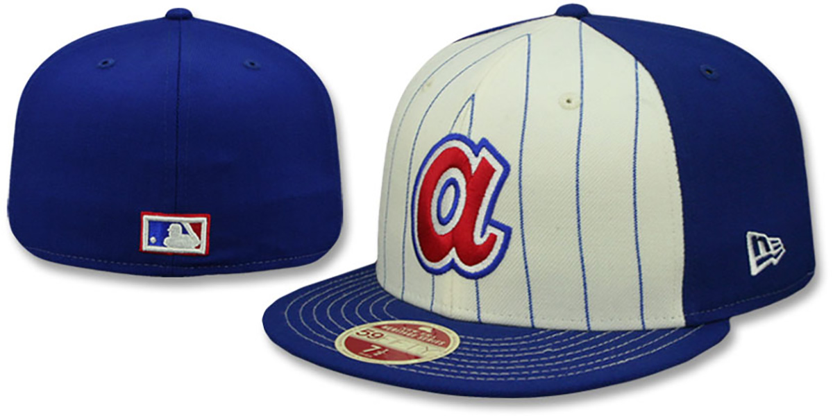 Authentic and ORIGINAL 59FIFTY fitted hat by New Era, team color royal blue wool blend deep crown with vintage off white front panels and royal pinstripes, royal blue visor with contrast stitching, royal undervisor, embroidered Cooperstown team logo on front, embroidered New Era flag logo on side, matching raised embroidered Cooperstown MLB logo on back. This Atlanta Braves baseball cap is made by New Era and is licensed by the MLB - Major League Baseball.