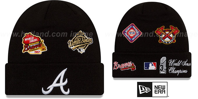 black acrylic knit beanie with with cuff, raised embroidered team logo on front of cuff, embroidered official World Series logos around crown from the years winning the MLB Championship, embroidered New Era Flag on side of cuff, embroidered team name and 3X World Series Champions script on back with embroidered MLB logo on back cuff. This Atlanta Braves hat is made by New Era and is licensed by the MLB - Major League Baseball.