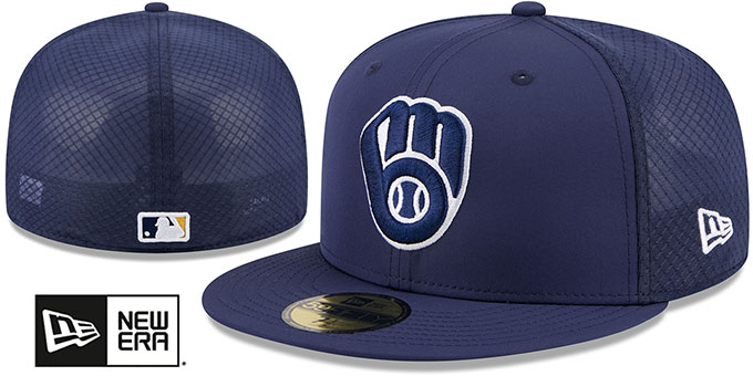 MLB Authentic Collection and ORIGINAL 59FIFTY fitted nylon poly hat by New Era, light navy blue nylon crown and visor with navy batting practice lightweight performance mesh middle and back panels, navy undervisor, raised embroidered team logo on front, embroidered New Era logo on side, raised embroidered MLB logo on back in team colors, This is the style of Onfield Batting Practice hat worn by MLB teams during the 2026 MLB season. This Milwaukee Brewers baseball cap is made by New Era and is licensed by the MLB - Major League Baseball.