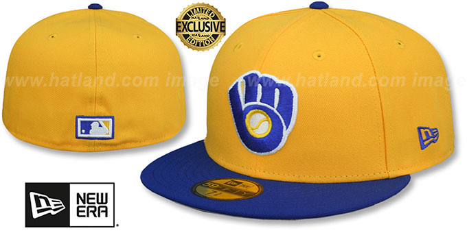 This authentic 59Fifty fitted hat by New Era features a deep gold crown and a royal blue visor. The undervisor is light grey, and the front showcases a raised, embroidered Cooperstown team logo. The side bears an embroidered New Era logo, while the back displays a matching raised, embroidered Cooperstown MLB logo. This Milwaukee Brewers hat is made by New Era and is licensed by the MLB - Major League Baseball.