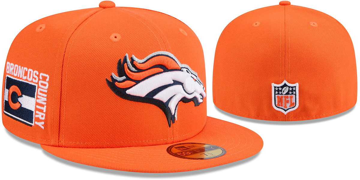 This authentic 59FIFTY fitted cap by New Era features an orange crown and visor made of premium polyester, with a light grey undervisor. The front showcases a raised, embroidered Broncos logo with a stylish silver shadow effect. The side displays an embroidered 'BRONCOS COUNTRY' patch from Colorado, while the back has an embroidered NFL shield logo in team colors. The opposite side bears the iconic New Era logo. This is the very 59FIFTY cap worn during the 2024 NFL Draft. This Denver Broncos baseball cap is made by New Era and is licensed by the NFL National Football League.