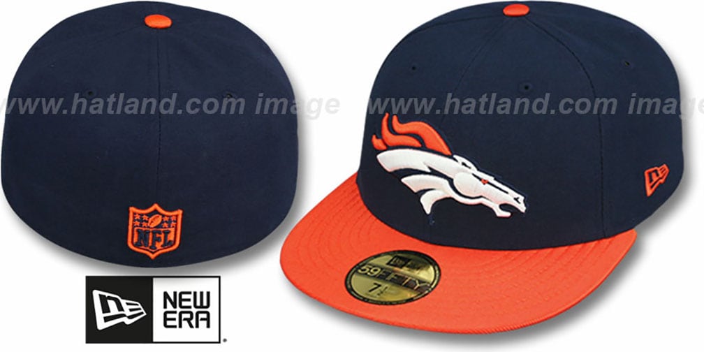 Authentic and ORIGINAL 59Fifty fitted hat by New Era, navy blue authentic poly deep crown with the high tech fabric that has revolutionary wicking ability, superior drying, and is shrink resistant, orange dazzle jersey material visor and matching cotton undervisor, raised embroidered team logo on front, raised embroidered NFL shield logo on back. This Denver Broncos hat is made by New Era and is licensed by the NFL National Football League.
