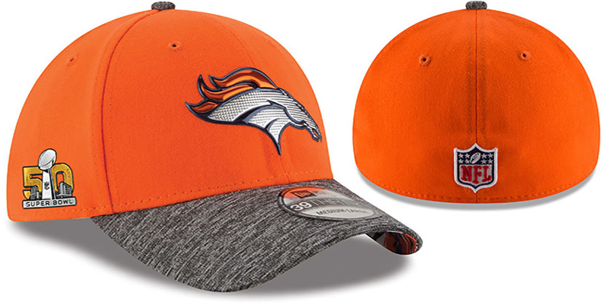 VERY LIMITED QUANTITIES, Orders now shipping!!, New Era 39THIRTY stretch fit flex hat by New Era, orange authentic poly deep crown with dark heather grey visor, silver foil undervisor team logo and team color print, Liquid Chrome foil team logo on front, embroidered New Era logo on side, Liquid Chrome SUPER BOWL 50 logo on opposite side, raised embroidered NFL shield logo on back, This is the sideline 59FIFTY hat worn during SUPER BOWL 50This Flex 39THIRTY hat fits approximate head sizes, SM/MED 6 7/8 - 7 3/8, MED/LG 7 1/4 - 7 5/8, LG/XL 7 1/2 - 8. This Denver Broncos baseball cap is made by New Era and is licensed by the NFL - National Football League.