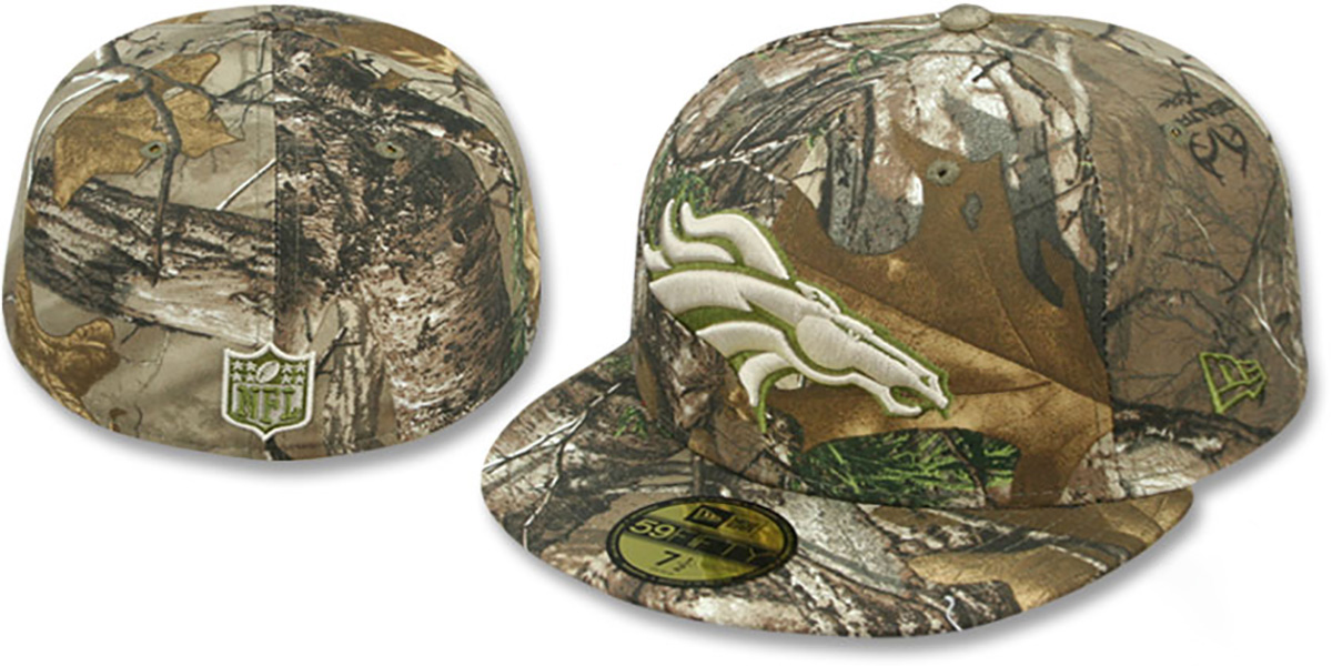 Authentic and ORIGINAL 59FIFTY fitted hat by New Era, Realtree Camouflage (tans, browns, and greens) cotton deep crown and visor with light grey undervisor, raised embroidered team logo on front in olive green and beige, embroidered New Era flag on side, matching raised embroidered NFL shield logo on back, EACH CAMO HAT PATTERN WILL BE SLIGHTLY DIFFERENT SO NO TWO HATS WILL BE THE SAME. This Denver Broncos baseball cap is made by New Era and is licensed by the NFL - National Football League.