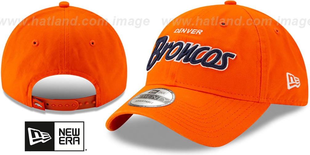 Low Profile 9TWENTY slouch fit trucker hat by New Era, orange soft washed cotton twill lightly structured rounded crown and visor, orange undervisor, embroidered city name above raised embroidered team script on front with white outline, New Era flag on side, matching adjustable Snapback strap on back with team logo hangtag. This Denver Broncos hat is made by New Era and is licensed by the NFL - National Football League.