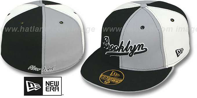 Authentic and Vintage, Old School New Era ORIGINAL 59FIFTY fitted hat, grey black and white alternating 100% wool panels and black visor, grey flip under visor. Raised embroidered team-script city name on front, Smaller city script on back. Small New Era stitched on left side. This baseball cap is made by New Era.