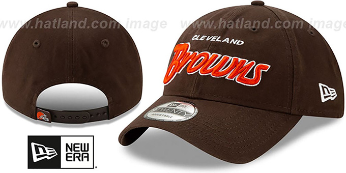 Low Profile 9TWENTY slouch fit trucker hat by New Era, brown soft washed cotton twill lightly structured rounded crown and visor, brown undervisor, embroidered city name above raised embroidered team script on front with white outline, New Era flag on side, matching adjustable Snapback strap on back with team logo hangtag. This Cleveland Browns hat is made by New Era and is licensed by the NFL - National Football League.