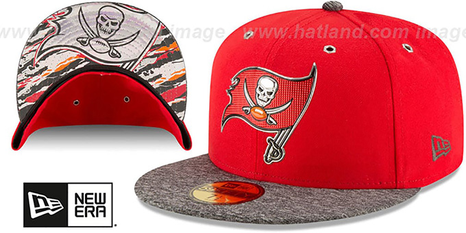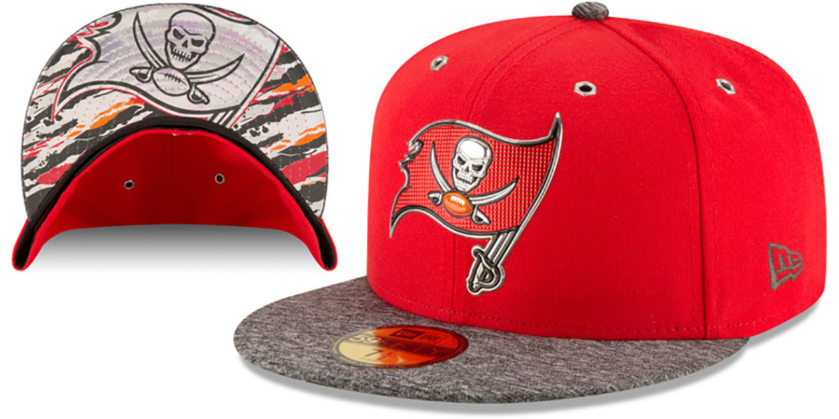Authentic and ORIGINAL 59Fifty fitted hat by New Era, team color red authentic poly deep crown with dark heather grey visor, silver foil undervisor team logo and team color print, Liquid Chrome foil team logo on front, embroidered New Era logo on side, raised embroidered NFL shield logo on back, This is the 59FIFTY hat worn during the 2016 NFL Draft. This Tampa Bay Buccaneers baseball cap is made by New Era and is licensed by the NFL National Football League.