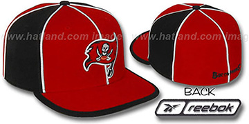 structured hat with rounded crown, black acrylic/wool blend crown and visor with red edging along brim and black undervisor, 3D team-script name embroidery with alternate team color outline, team logo embroidered on back above velcro adjustable strap closure. This Tampa Bay Buccaneers hat is made by American Needle and is licensed by the NFL - National Football League.