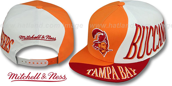 Authentic wool blend adjustable hat by Mitchell & Ness with original cut and flat brim, three team color crown and visor orange - red - white, throwback green undervisor, raised embroidered team logo on front, embroidered team name on side panels with embroidered city name on visor, embroidered Mitchell & Ness logo on back above two color adjustable plastic Snapback strap. This Tampa Bay Buccaneers hat is made by Mitchell & Ness and is licensed by the NFL National Football League.