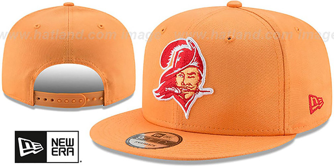Original fit 9FIFTY adjustable cotton hat by New Era that has similar deep crown and flat brim fit as the 59-Fifty, team color tangerine orange crown and visor, light grey undervisor, raised embroidered team logo on front in Throwback team colors, matching embroidered New Era flag on side, matching adjustable Snapback strap closure . This Tampa Bay Buccaneers hat is made by New Era and is licensed by the NFL - National Football League.