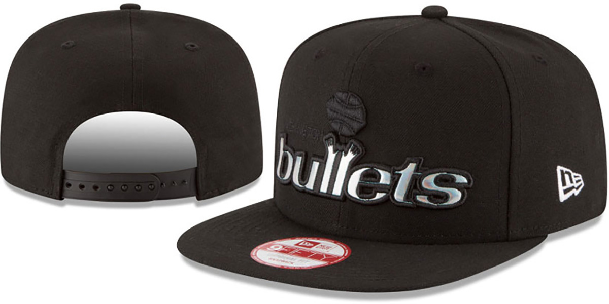 Authentic adjustable hat by New Era with original 9FIFTY cut and flat brim, black authentic crown and visor, metallic silver foil undervisor, raised embroidered Hardwood Classics team logo on front in black with metallic silver foil fill, embroidered New Era logo on side, black adjustable SnapBack closure. This Washington Bullets hat is made by New Era and is licensed by the NBA - National Basketball Association.
