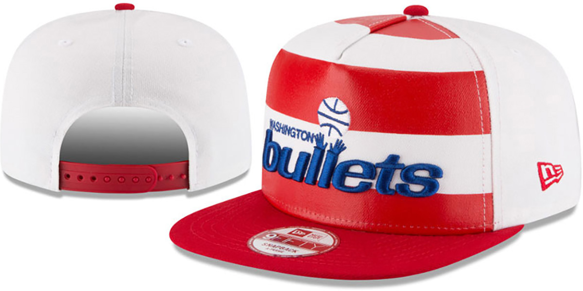 Original 9FIFTY 5-panel A-Frame adjustable hat by New Era that has similar deep crown and flat brim fit as the 59-Fifty, white authentic poly crown and red visor, red undervisor, raised embroidered Hardwood Classics team logo on front, printed jersey logo on front, secondary team color plastic adjustable Snapback strap. This Washington Bullets hat is made by New Era and is licensed by the NBA - National Basketball Association.