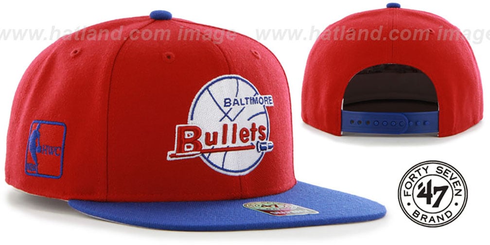 Authentic wool blend adjustable hat by Twin 47 Brand with original cut and flat brim, red crown and royal blue visor, light grey undervisor, raised embroidered team logo on front, matching embroidered HWC logo embroidered on side, matching adjustable plastic Snapback strap closure. This Baltimore Bullets hat is made by 47 Brand and is licensed by the NBA - National Basketball Association.