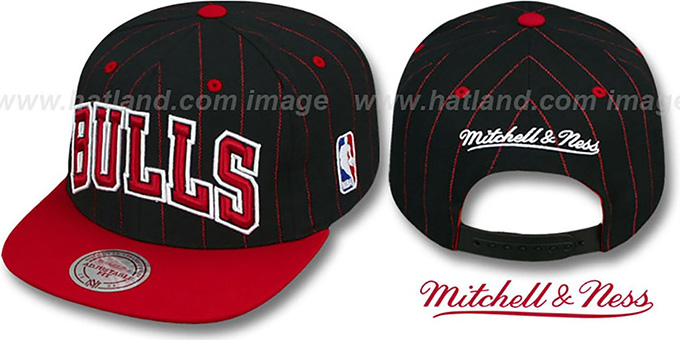 Authentic wool blend adjustable hat by Mitchell & Ness with original cut and flat brim, black crown with red pinstripes and red visor, throwback grey undervisor, raised embroidered arched team name on front, NBA logo embroidered on side, commemorative embroidery inside headband, embroidered Mitchell & Ness logo on back above adjustable plastic Snapback strap This hat made to hookup with Commemorative Bulls Jordan Jersey. This item is on SALE!. This Chicago Bulls hat is made by Mitchell & Ness and is licensed by the NBA National Basketball Association.