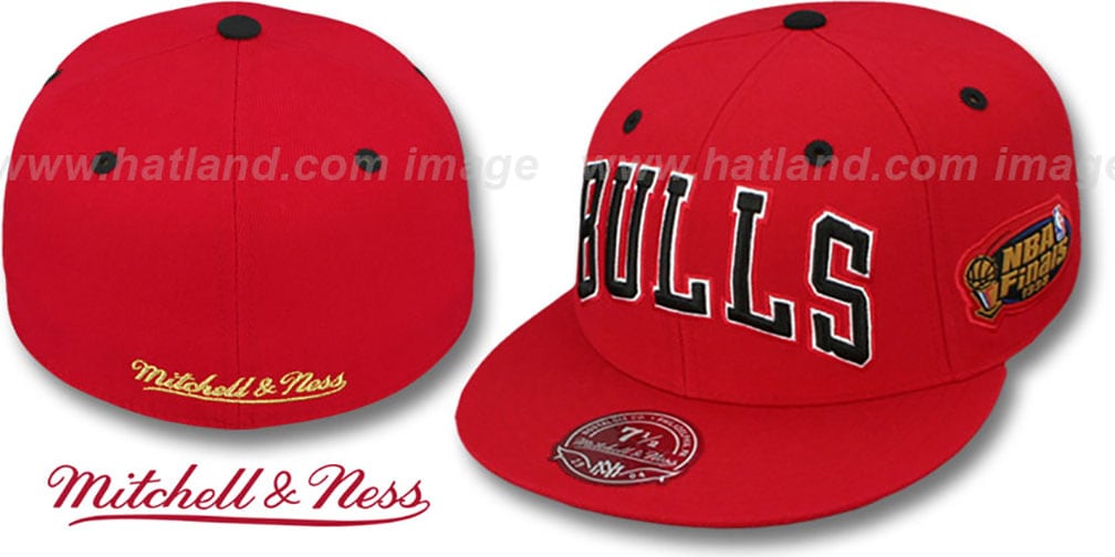 Authentic wool fitted hat by Mitchell & Ness with original cut and flat brim, red crown and visor, black undervisor, raised embroidered team font logo on front, 1998 NBA Finals embroidery on side, Mitchell & Ness logo on rear of hat. This Chicago Bulls hat is made by Mitchell & Ness and is licensed by the NBA - National Basketball Association.