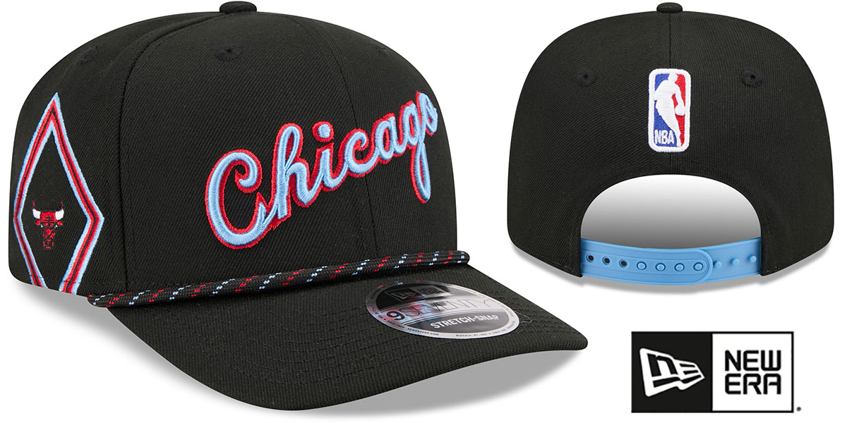 The New Era Low Profile 9SEVENTY STRETCH SNAP hat features a structured, rounded crown and pre-curved visor, black authentic poly crown and visor that features a matching rope, light grey undervisor, black sweatband, raised embroidered City Edition logo on front, embroidered New Era logo on side, matching embroidered City Edition design logo on opposite side, raised embroidered NBA logo on back in white with red and royal fill above matching stretch snap closure, Produced to match NBA City Edition Jerseys worn throughout select 2025-2026 games. This Chicago Bulls hat is made by New Era and is licensed by the NBA - National Basketball Association.