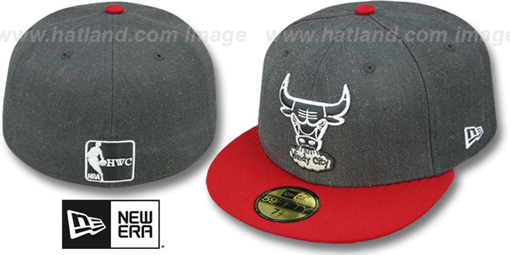 Authentic and ORIGINAL 59Fifty fitted hat by New Era, charcoal heather grey wool blend deep crown with red visor, light grey undervisor, raised embroidered Hardwood Classics, Old School team logo on front in matching charcoal grey and white, matching embroidered Hardwood Classics, Old School logo on back. This Chicago Bulls hat is made by New Era and is licensed by the NBA - National Basketball Association.