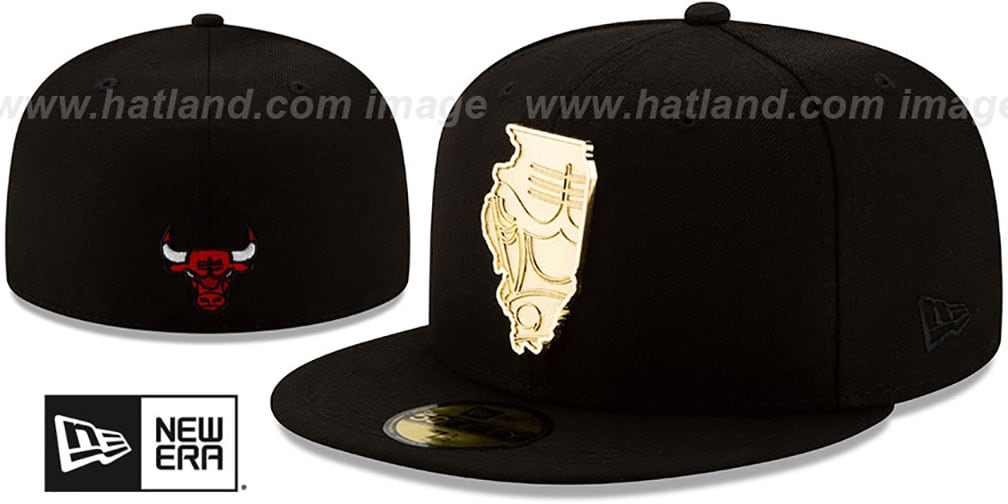 Authentic and ORIGINAL 59FIFTY fitted hat by New Era, black authentic poly deep crown and visor, black undervisor, gold Illinois state metal badge attached to front and team logo within the badge, matching embroidered New Era logo on side, embroidered team logo on back. This Chicago Bulls baseball cap is made by New Era and is licensed by the NBA - National Basketball Association.