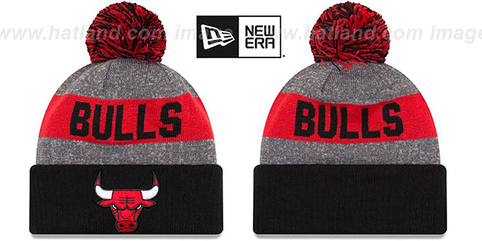 charcoal grey acrylic ribbed knit crown with red knit stripe and team name in opposite team color, soft light grey poly/wool flannel liner, raised embroidered team logo on black ribbed cuff, matching two color pom-pom on top, New Era Flag embroidery on side. This Chicago Bulls hat is made by New Era and is licensed by the NBA National Basketball Association.