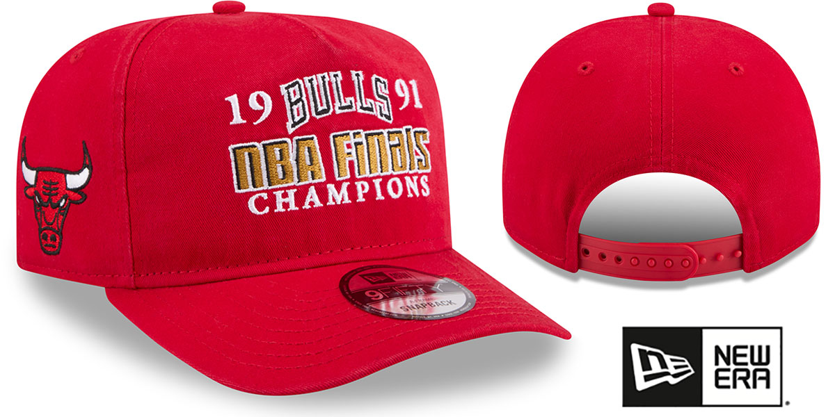 Adjustable A-FRAME five panel hat by New Era with pinched seam on front panels, red cotton twill crown and visor with throwback dark kelly green undervisor, flat embroidered 1991 NBA FINALS CHAMPIONS logo on front, embroidered New Era logo on side, flat embroidered team logo on opposite side, matching adjustable Snapback closure. This Chicago Bulls hat is made by New Era and is licensed by the NBA - National Basketball Association.