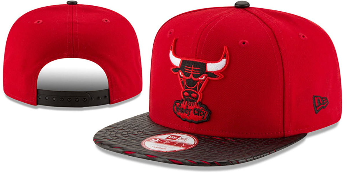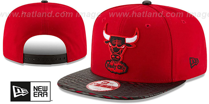 Authentic 9FIFTY adjustable hat by New Era, red authentic poly crown and visor with black p/u faux ripped leather stitched over top of brim, light grey undervisor, raised embroidered Hardwood Classics team logo on front, embroidered New Era logo on side, black adjustable plastic Snapback strap. This Chicago Bulls hat is made by New Era and is licensed by the NBA - National Basketball Association.