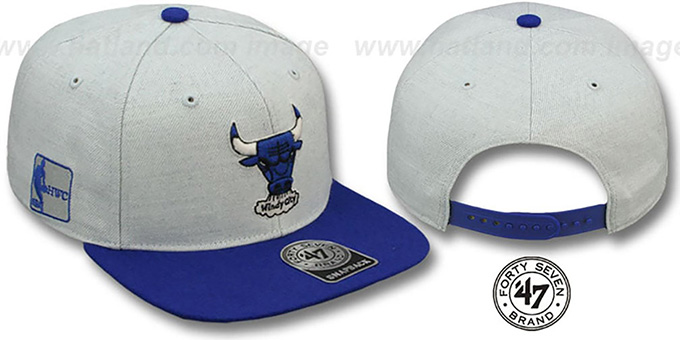 Authentic wool blend adjustable hat by Twin 47 Brand with original cut and flat brim, light grey satchel crown and royal blue visor, throwback green undervisor, raised embroidered team logo on front, HWC logo embroidered on side, matching adjustable plastic Snapback strap. This Chicago Bulls hat is made by 47 Brand and is licensed by the NBA - National Basketball Association.