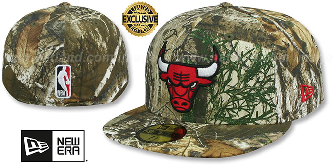 Authentic and ORIGINAL 59FIFTY fitted hat by New Era, Realtree Camouflage (tans, browns, and greens) cotton deep crown and visor with light grey undervisor, raised embroidered team logo on front in team colors, embroidered New Era flag on side, raised embroidered NBA logo on back in team colors, EACH CAMO HAT PATTERN WILL BE SLIGHTLY DIFFERENT SO NO TWO HATS WILL BE THE SAME. This Chicago Bulls baseball cap is made by New Era and is licensed by the NBA - National Basketball Association.