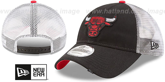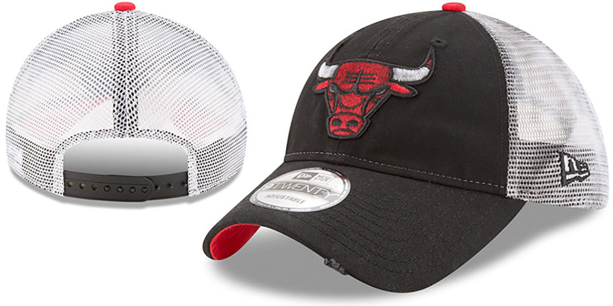Low Profile 9TWENTY slouch fit trucker hat by New Era, black unstructured rounded crown and visor that appears dirty and weathered and with a ripped edge of brim, white soft trucker mesh that appears like there are oil stains throughout, red undervisor, raised embroidered team logo on front in team colors with appearance of grease in the threads, New Era flag on side, matching adjustable Snapback strap on back. This Chicago Bulls hat is made by New Era and is licensed by the NBA - National Basketball Association.